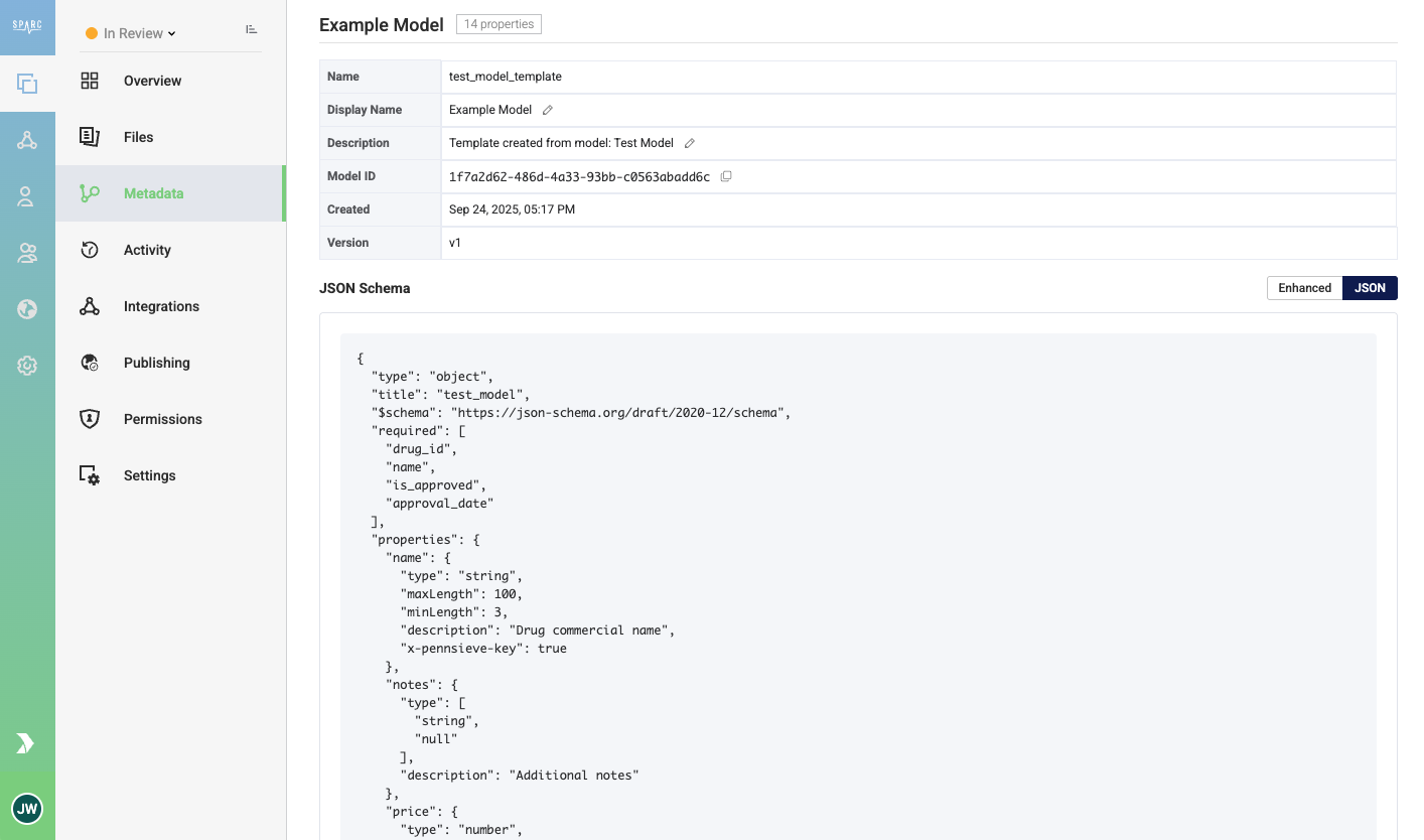 Once created, you can inspect models using our enhanced viewer, or directly through the JSON-Schema object. The JSON Schema viewer shows the full model definition that is stored in Pennsieve and can include attributes that are not highlighted in the enhanced viewer.