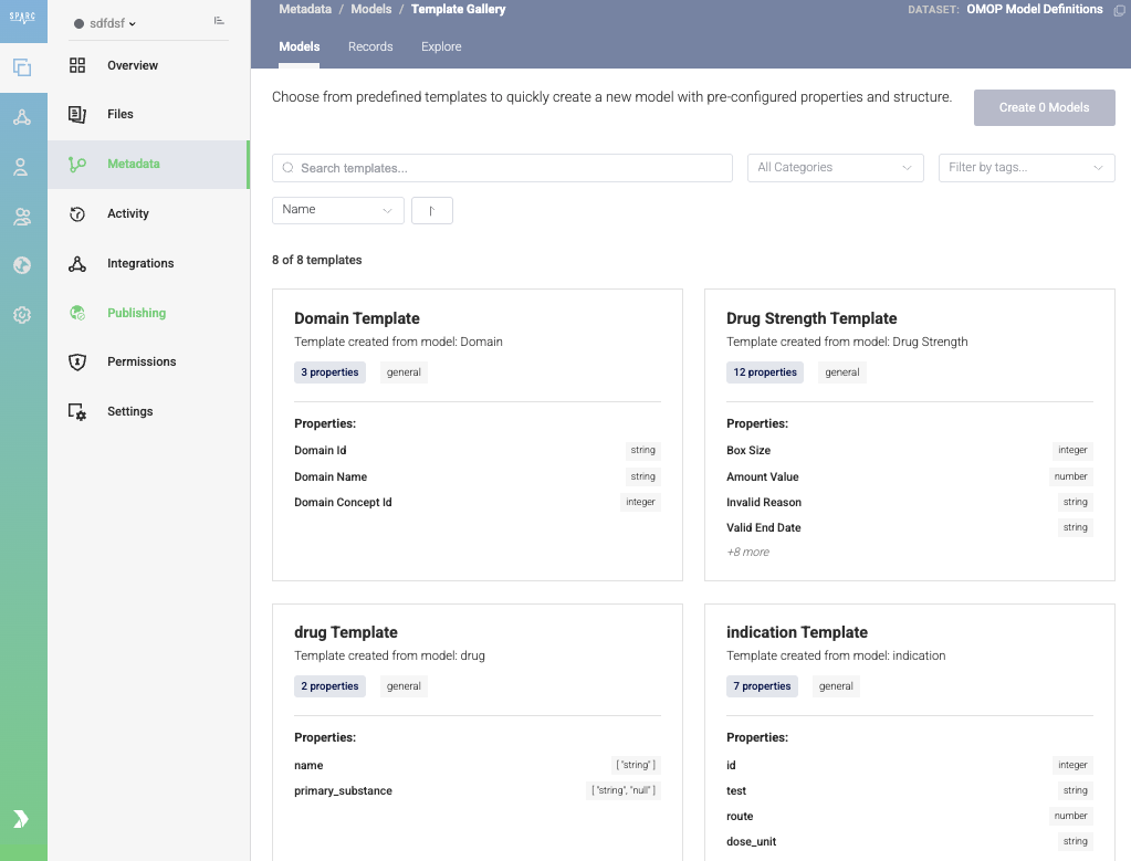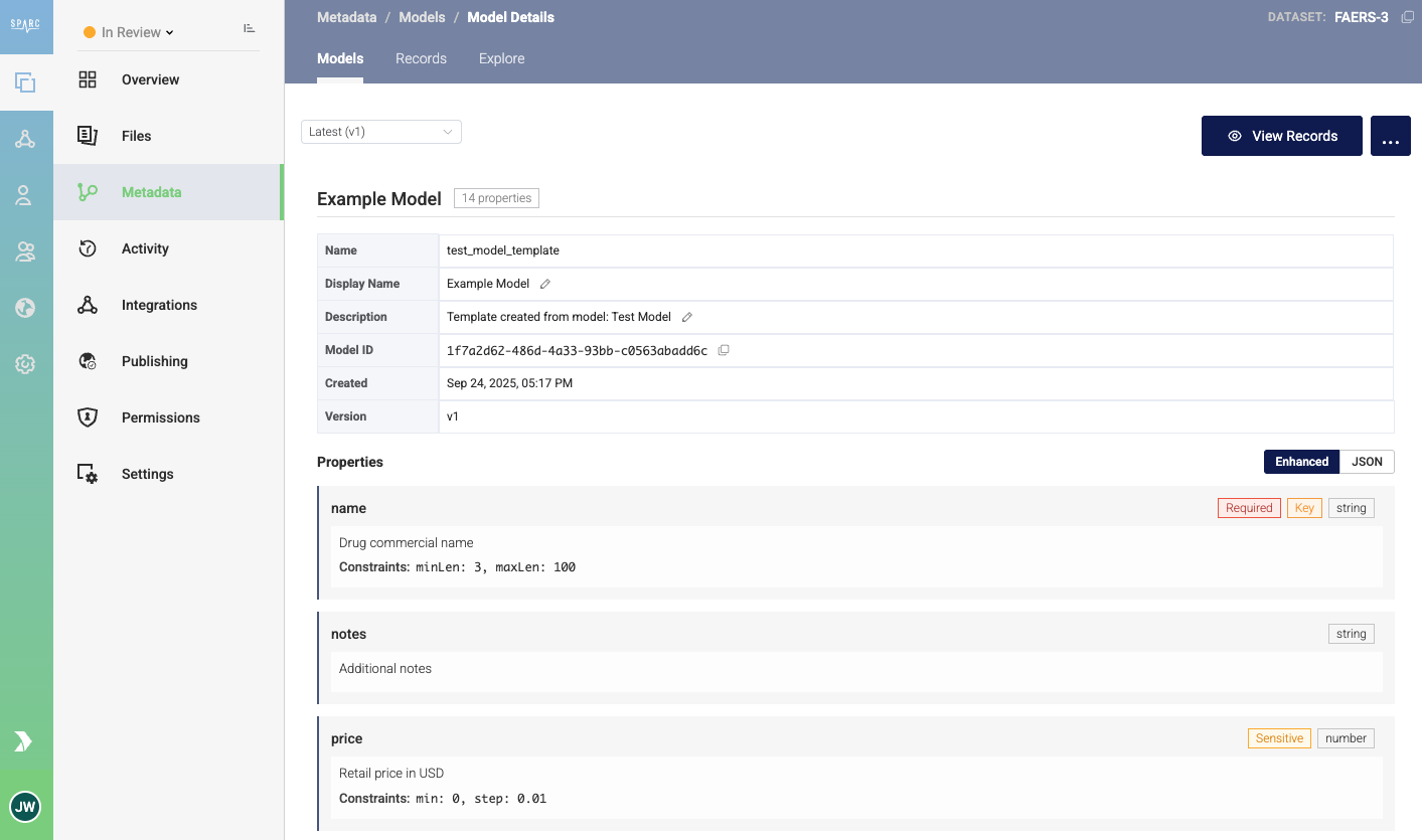 Pennsieve uses JSON, and JSON-Schema to define metadata models and records. This allows maximum flexibility for users to define their own schema, and record validation rules. Models are always associated with a specific dataset and are versioned within the scope of a dataset. To share models between datasets within a Workspace, users can add Model Templates to the Model Template Gallery. New models can be created from Templates within a dataset.