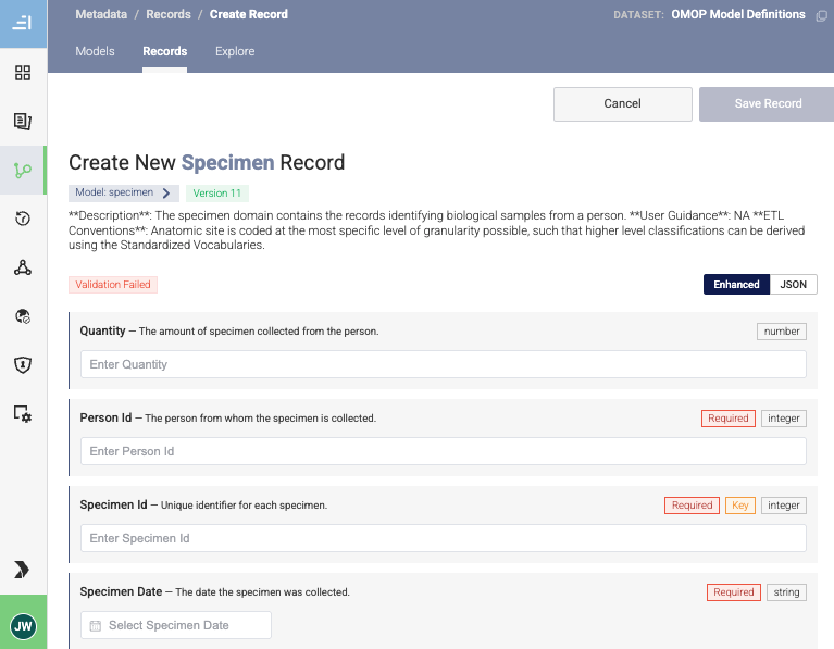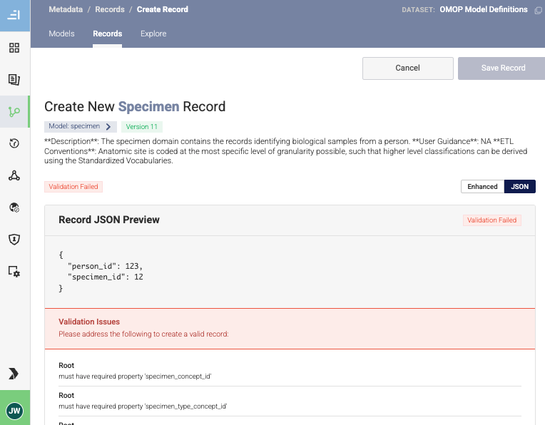 Once models are defined in a dataset, you can create and store records in the dataset. This can be done from the web-application or in bulk using the Pennsieve API. A record is stored as a JSON object in the Pennsieve database. When creating metadata records, they are automatically validated against the JSON Schema model version that is associated with the record.